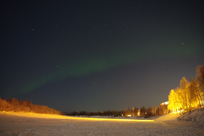 ホテルの真裏の川にオーロラがかかっていました。